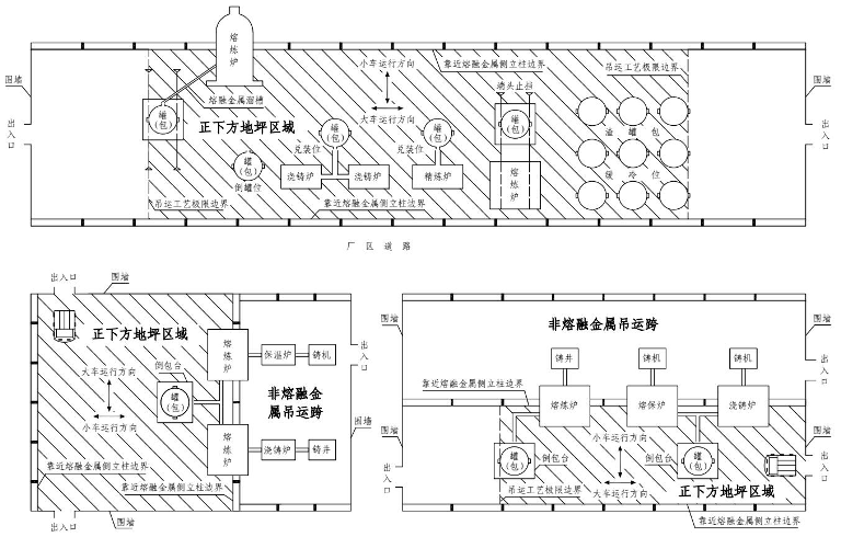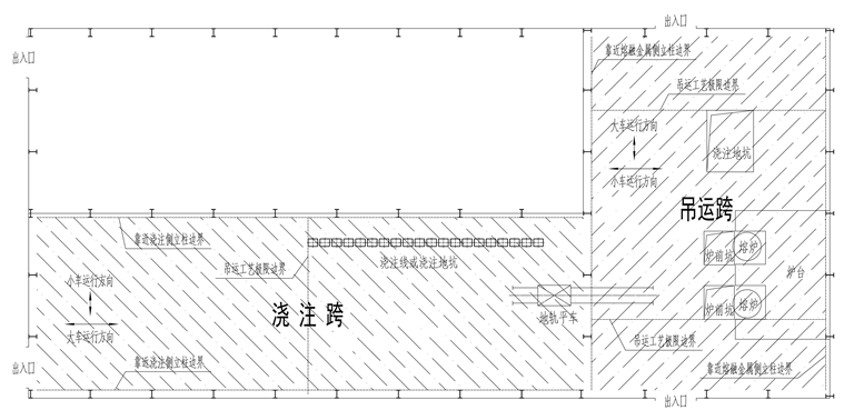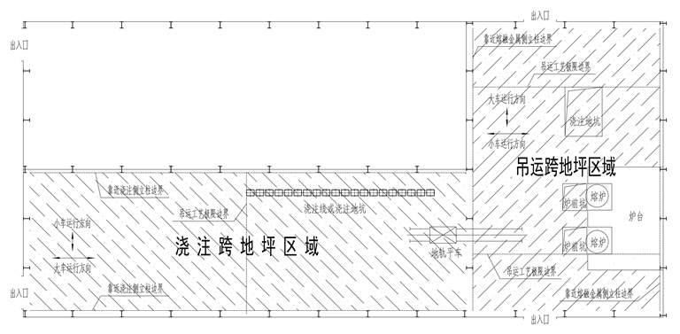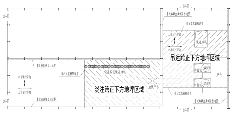 注:“正下方地坪區(qū)域”是指橫向以吊運(yùn)跨兩側(cè)立柱靠近熔融金屬吊運(yùn)側(cè)的立柱邊線為界,縱向以吊運(yùn)跨最兩端的鐵水、鋼水、液渣吊運(yùn)工藝極限邊界為界的車間地坪區(qū)域(圖4-2)。