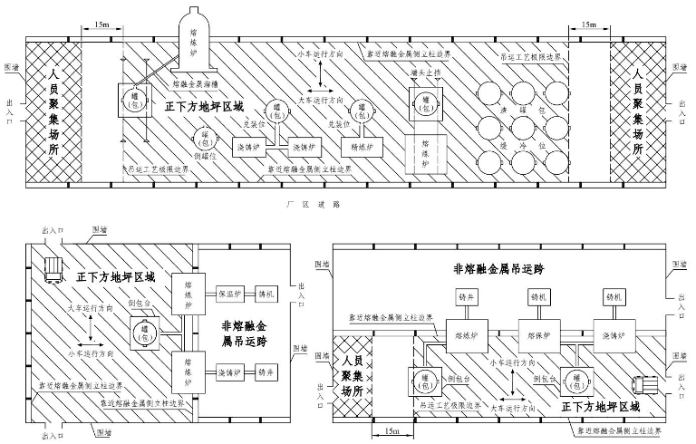 (2)煉鋼廠、鐵合金廠的會(huì)議室、活動(dòng)室、休息室、操作室、交接班室、更衣室(含澡堂),設(shè)置在熔融金屬吊運(yùn)跨距離吊運(yùn)工藝極限邊界50米以內(nèi)的地坪區(qū)域(縱向兩端方向,圖4-3)。